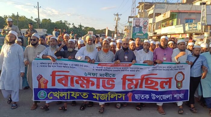 সুনামগঞ্জের ছাতকে কেন্দ্র ঘোষিত খেলাফত মজলিসের ৬ দফা দাবিতে শুক্রবার বিকেলে গোবিন্দগঞ্জ পয়েন্টে এক বিক্ষোভ মিছিল ও সমাবেশ অনুষ্ঠিত হয়েছে। খেলাফত মজলিস ছাতক উপজেলা সভাপতি মাওলানা আবুল হাসনাতের সভাপতিত্বে ও সাধারণ সম্পাদক মাওলানা জসিম উদ্দিনের পরিচালনায় বিক্ষোভ মিছিল পরবর্তী সমাবেশে প্রধান অতিথির বক্তব্য রাখেন, কেন্দ্রীয় সাংগঠনিক সম্পাদক, অধ্যক্ষ আবদুল হান্নান। প্রধান বক্তার বক্তব্য রাখেন, আসন্ন জাতীয় সংসদ নির্বাচনে সুনামগঞ্জ-৫ ছাতক-দোয়ারাবাজার আসনের খেলাফত মসজিলের সমর্থিত সংসদ সদস্য পদপ্রার্থী হাফেজ মাওলানা আবদুল কাদির।
