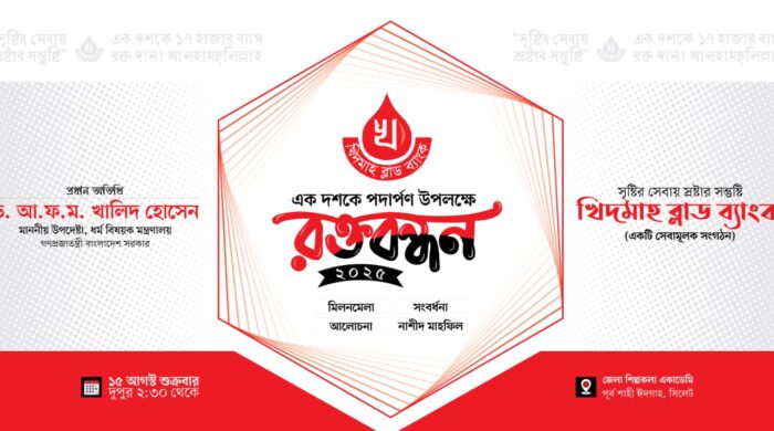 মানবতার সেবায় নিবেদিত সিলেটের বৃহত্তর সেচ্ছাসেবী সংগঠন খিদমাহ ব্লাড ব্যাংক তাদের গৌরবময় এক দশকে পদার্পণ উদযাপন করতে আয়োজন করেছে বর্ণাঢ্য অনুষ্ঠান “রক্তবন্ধন–২০২৫”। আগামীকাল (১৫ আগস্ট) শুক্রবার দুপুর ২টা ৩০